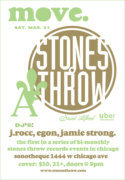 SAT MARCH 31ST @ SONOTHEQUE:COME CELEBRATE THE DEBUT OF STONES THROW'S BI-MONTHLY RESIDENCY IN CHICAGO (MOVE),AS WELL AS THE GRAND REOPENING OF SAINT ALFRED'S + SPECIAL SURPRISE GUESTS!!!